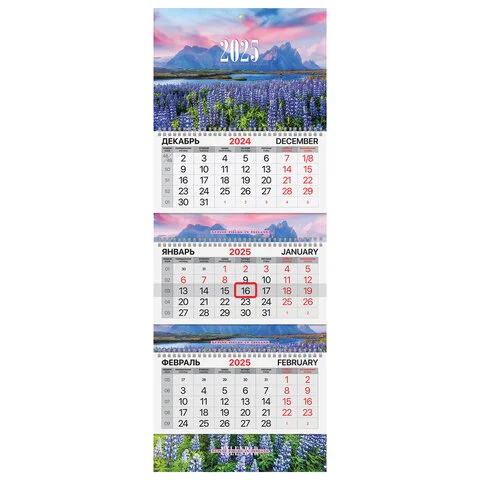 Офисный календарь на 2025 год на 3 гребнях. Для удобства планирования состоит из 3 блоков с календарными сетками на три месяца – предыдущий, текущий и следующий. Курсор-бегунок выделяет текущую дату.