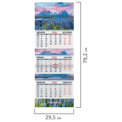 Блок календаря напечатан на мелованной бумаге плотностью 80 г/м2. Подложка изготовлена из мелованного картона плотностью 250 г/м2. Вертикальное расположение. Размер – 29,5х79,2 см.
