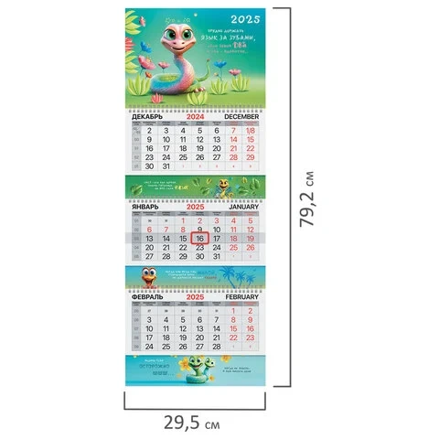 Блок календаря напечатан на мелованной бумаге плотностью 80 г/м2. Подложка изготовлена из мелованного картона плотностью 250 г/м2. Вертикальное расположение. Размер – 29,5х79,2 см.