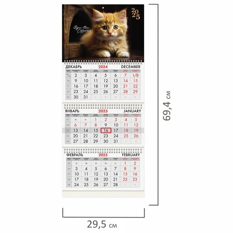 Офисный календарь на 2025 год на 3-х гребнях. Для удобства планирования состоит из 3-х блоков с календарными сетками на три месяца - предыдущего, текущего и последующего. Блок календаря напечатан на офсетной бумаге плотностью 65 г/м2. Подложка изготовлена из мелованного картона плотностью 235 г/м2. Курсор-бегунок выделяет текущую дату. Вертикальное расположение.