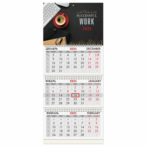 Офисный календарь на 2025 год на 3-х гребнях. Для удобства планирования состоит из 3-х блоков с календарными сетками на три месяца - предыдущего, текущего и последующего. Блок календаря напечатан на офсетной бумаге плотностью 65 г/м2. Подложка изготовлена из мелованного картона плотностью 235 г/м2. Курсор-бегунок выделяет текущую дату. Вертикальное расположение.