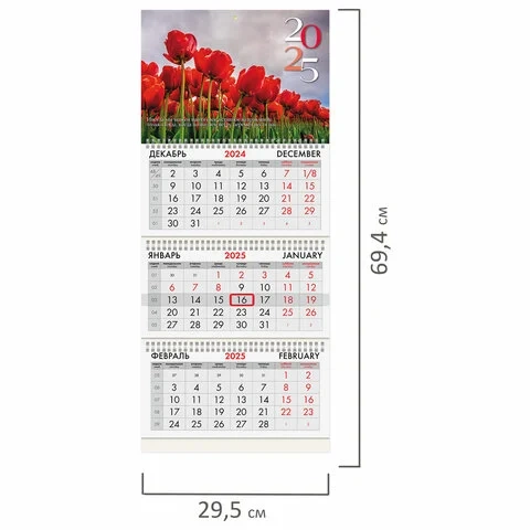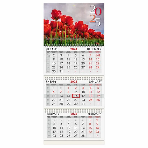 Календарь квартальный на 2025 г., 3 блока, 3 гребня, с бегунком, офсет, BRAUBERG, 'Тюльпаны', 116109