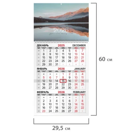 Офисный календарь на 2026 год на гребне. Состоит из 1 блока с календарными сетками на три месяца - предыдущий, текущий и последующий. Блок календаря напечатан на мелованной бумаге плотностью 80 г/м2. Подложка изготовлена из мелованного картона плотностью 280 г/м2. Курсор-бегунок выделяет текущую дату. Вертикальный формат. Размер - 29,5х60 см.