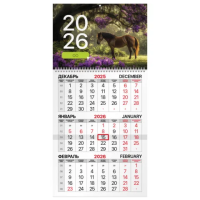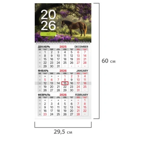 Офисный календарь на 2026 год на гребне. Состоит из 1 блока с календарными сетками на три месяца - предыдущий, текущий и последующий. Блок календаря напечатан на мелованной бумаге плотностью 80 г/м2. Подложка изготовлена из мелованного картона плотностью 280 г/м2. Курсор-бегунок выделяет текущую дату. Вертикальный формат. Размер - 29,5х60 см.