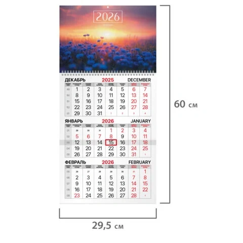 Календарь квартальный на 2026 г., 1 блок, 1 гребень, бегунок, мелованная бумага, BRAUBERG, 'Василько