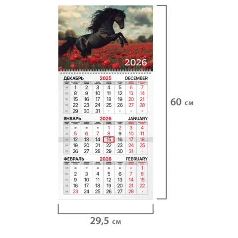 Офисный календарь на 2026 год на гребне. Состоит из 1 блока с календарными сетками на три месяца – предыдущий, текущий и последующий. Блок календаря напечатан на офсетной бумаге плотностью 65 г/м2. Подложка изготовлена из мелованного картона плотностью 280 г/м2. Курсор-бегунок выделяет текущую дату. Вертикальный формат. Размер - 29,5х60 см.