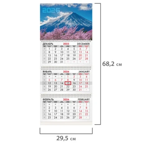 Календарь квартальный на 2026 г., 3 блока, 3 гребня, бегунок, мелованная бумага, BRAUBERG, 'Фудзи',