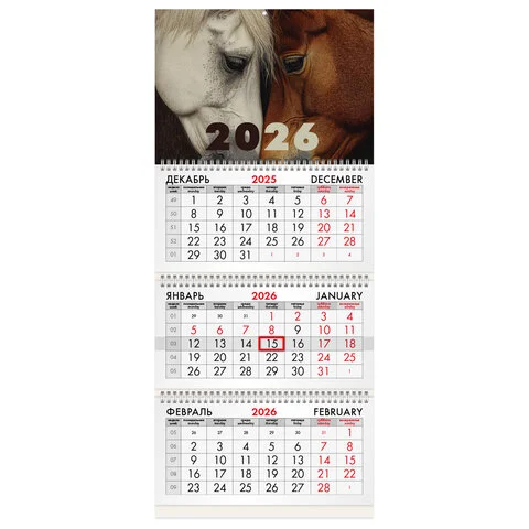 Офисный календарь на 2026 год на 3 гребнях. Для удобства планирования состоит из 3 блоков с календарными сетками на три месяца – предыдущий, текущий и следующий.
