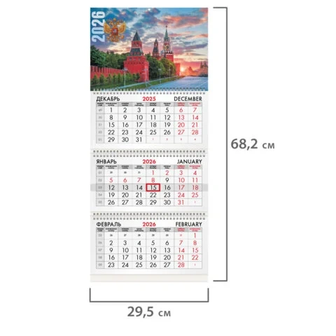 Офисный календарь на 2026 год на 3 гребнях. Для удобства планирования состоит из 3 блоков с календарными сетками на три месяца – предыдущий, текущий и следующий.