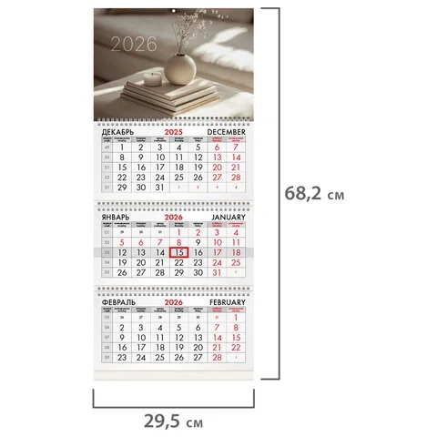 Офисный календарь на 2026 год на 3 гребнях. Для удобства планирования состоит из 3 блоков с календарными сетками на три месяца – предыдущий, текущий и следующий.