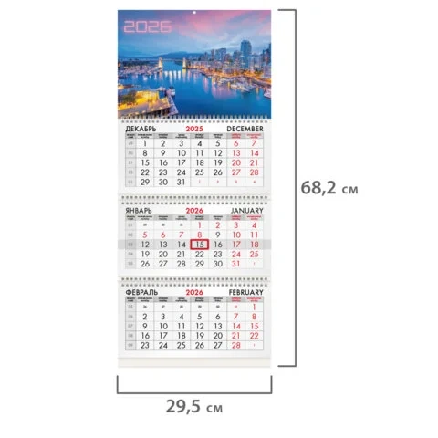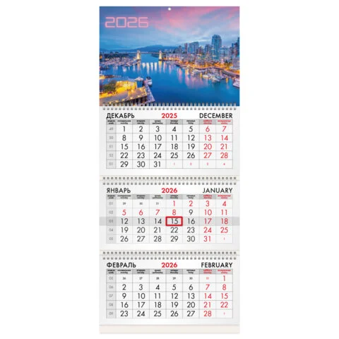 Офисный календарь на 2026 год на 3 гребнях. Состоит из 3 блоков с календарными сетками на три месяца – предыдущий, текущий и последующий. Блок календаря напечатан на офсетной бумаге плотностью 65 г/м2. Подложка изготовлена из мелованного картона плотностью 235 г/м2. Курсор-бегунок выделяет текущую дату. Вертикальный формат.