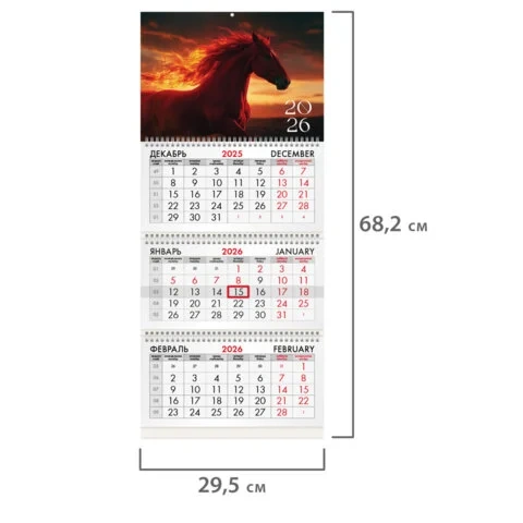 Офисный календарь на 2026 год на 3 гребнях. Состоит из 3 блоков с календарными сетками на три месяца – предыдущий, текущий и последующий. Блок календаря напечатан на офсетной бумаге плотностью 65 г/м2. Подложка изготовлена из мелованного картона плотностью 235 г/м2. Курсор-бегунок выделяет текущую дату. Вертикальный формат.