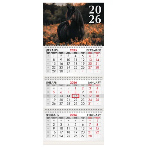 Офисный календарь на 2026 год на 3 гребнях. Состоит из 3 блоков с календарными сетками на три месяца – предыдущий, текущий и последующий. Блок календаря напечатан на офсетной бумаге плотностью 65 г/м2. Подложка изготовлена из мелованного картона плотностью 235 г/м2. Курсор-бегунок выделяет текущую дату. Вертикальный формат.