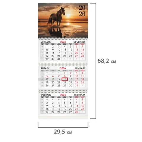 Офисный календарь на 2026 год на 3 гребнях. Состоит из 3 блоков с календарными сетками на три месяца – предыдущий, текущий и последующий. Блок календаря напечатан на офсетной бумаге плотностью 65 г/м2. Подложка изготовлена из мелованного картона плотностью 235 г/м2. Курсор-бегунок выделяет текущую дату. Вертикальный формат.