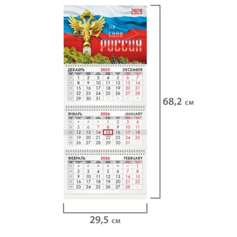 Офисный календарь на 2026 год на 3 гребнях. Состоит из 3 блоков с календарными сетками на три месяца – предыдущий, текущий и последующий. Блок календаря напечатан на офсетной бумаге плотностью 65 г/м2. Подложка изготовлена из мелованного картона плотностью 235 г/м2. Курсор-бегунок выделяет текущую дату. Вертикальный формат.