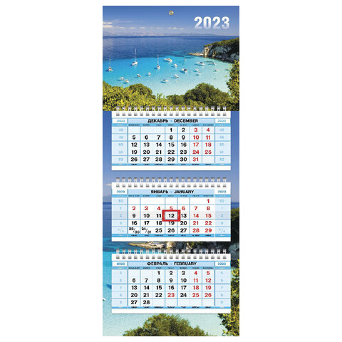 Календарь квартальный Hatber Мини Живописная бухта, 3 блока, 3 гребня, с бегунком, 2023