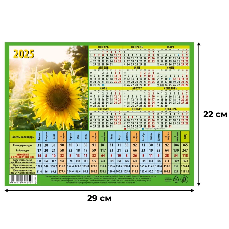 Календарь листовой Табель производс, 2025, мелов, 220х290,5шт/уп Календарь листовой на 2025 год с производственным табелем, формат 220х290 мм . Предназначен для использования работниками бухгалтерий и отдела кадров. Отпечатан на мелованной глянцевой бумаге плотностью 135 г/м2 (полноцветная печать). В верхней части яркий слайд и календарная сетка. В нижней части - производственный табель с количеством рабочих и выходных дней и количеством рабочих часов для каждого месяца, квартала, полугодия и года. В упаковке (европакет) комплект из 5 штук календарей одного дизайна.
