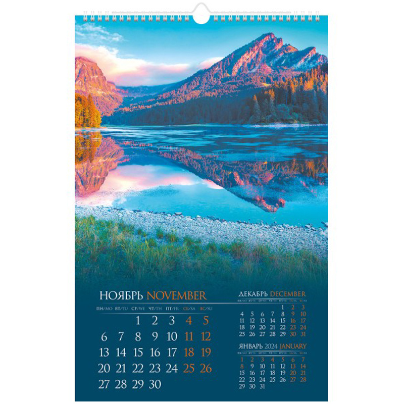 Настенный перекидной календарь на гребне с ригелем (металлический стержень с петлей). Полный формат: 300х450 мм, объем: 12 листов. Обложка: мелованная бумага 200 гр. Внутренний блок: мелованная бумага 115 гр. Жесткая подложка. Индивидуальная упаковка с европодвесом. В календаре каждому месяцу соответствует отдельная страница с ярким красочным изображением и удобной календарной сеткой. Календари отпечатаны на современном высокотехнологичном оборудовании и соответствуют стандартам качества.