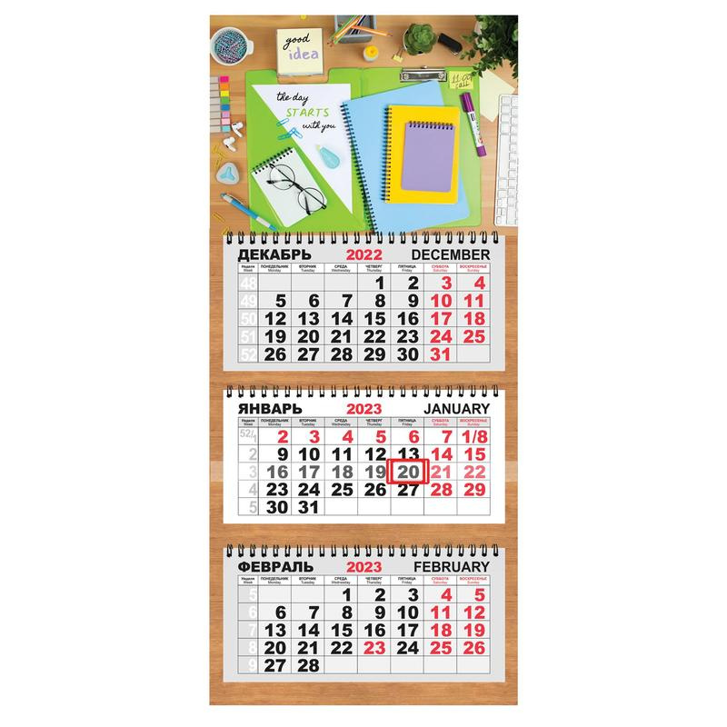 Большой настенный квартальный календарь размером 297?710 мм «Офис» — многофункциональный помощник на 2023 год для дома и офиса. Красочный лакированный постер 297?220 мм. В конструкции календаря предусмотрено отверстие для крепления на стене — металлический люверс. Передвижной бегунок (курсор) используется для выделения текущей даты. Выходные и праздничные дни выделены красным цветом. Каждый календарь поставляется в упаковке.