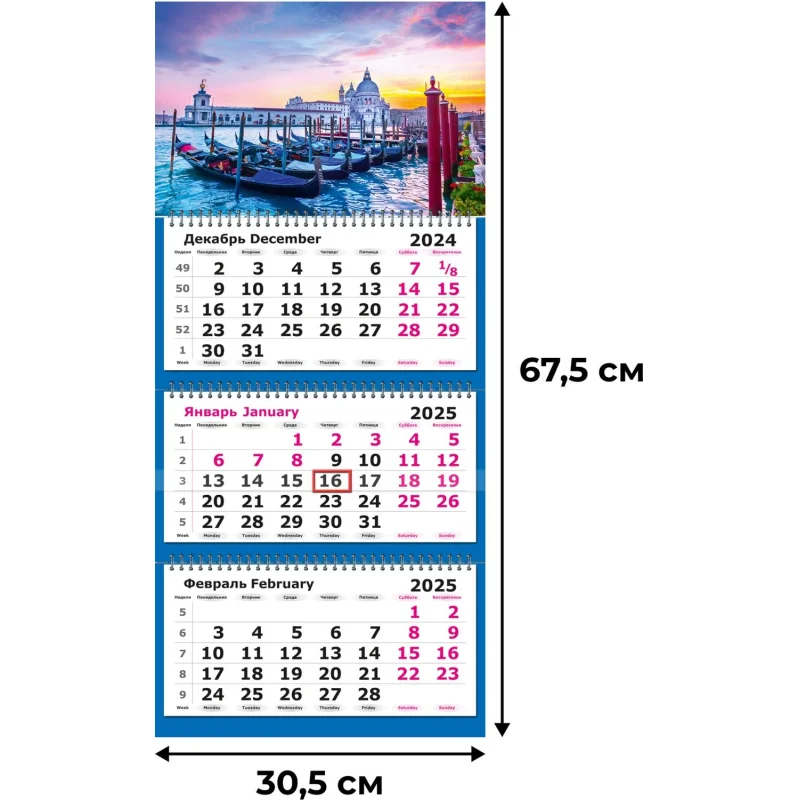 Календарь настенный 3-х блочный 2025,305х675,Гондолы в Венеции,3спир,80г/м2 Настенный трехблочный календарь 'Гондолы в Венеции' на 2025 год с курсором, формат 305x675 мм, в индивидуальной упаковке (пакете). Состоит из постера на мелованном картоне плотностью 300 г/кв.м, трех календарных блоков с нумерацией недель на офсетной бумаге. Календарь скреплен тремя металлическими гребнями, крепится на стену при помощи люверса.