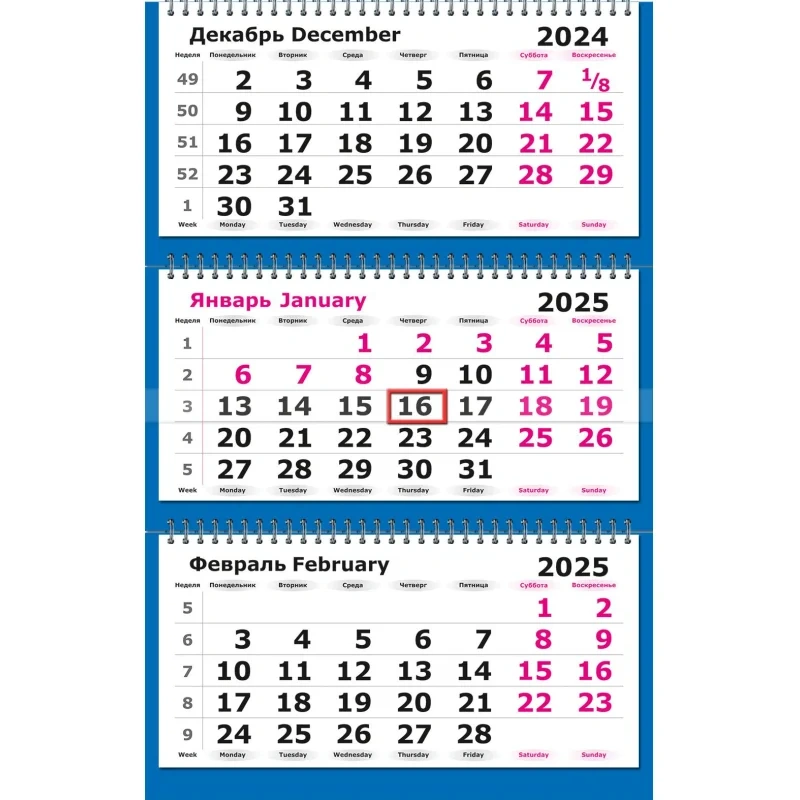 Настенный трехблочный календарь 'Госсимволика' на 2025 год с курсором, формат 305x675 мм, в индивидуальной упаковке (пакете). Состоит из постера на мелованном картоне плотностью 300 г/кв.м, трех календарных блоков с нумерацией недель на офсетной бумаге. Календарь скреплен тремя металлическими гребнями, крепится на стену при помощи люверса. Размер подложки 305x160 мм, размер блока календаря 290x140 мм. Размер в сложенном виде 305x195 мм. Товар поставляется в 2-х вариантах подложки.