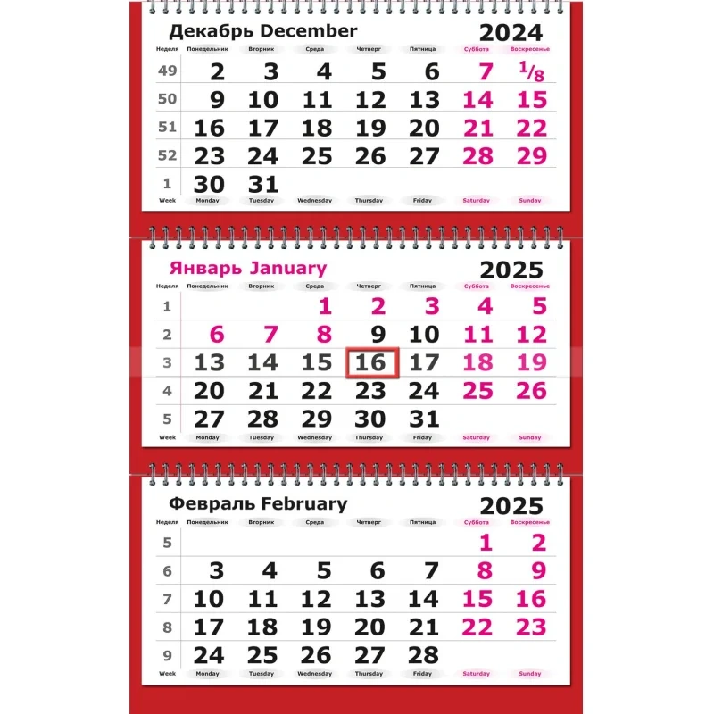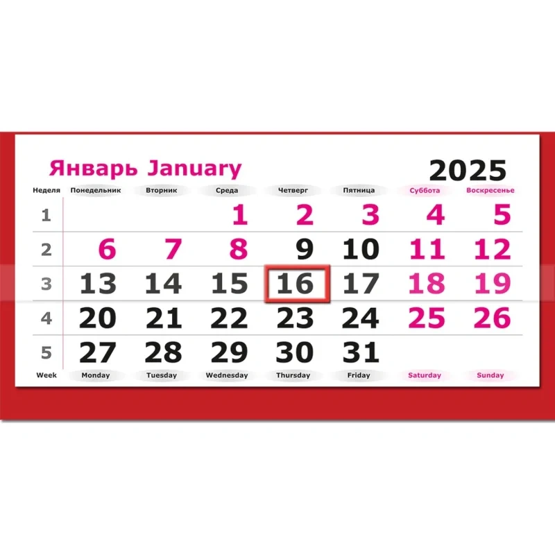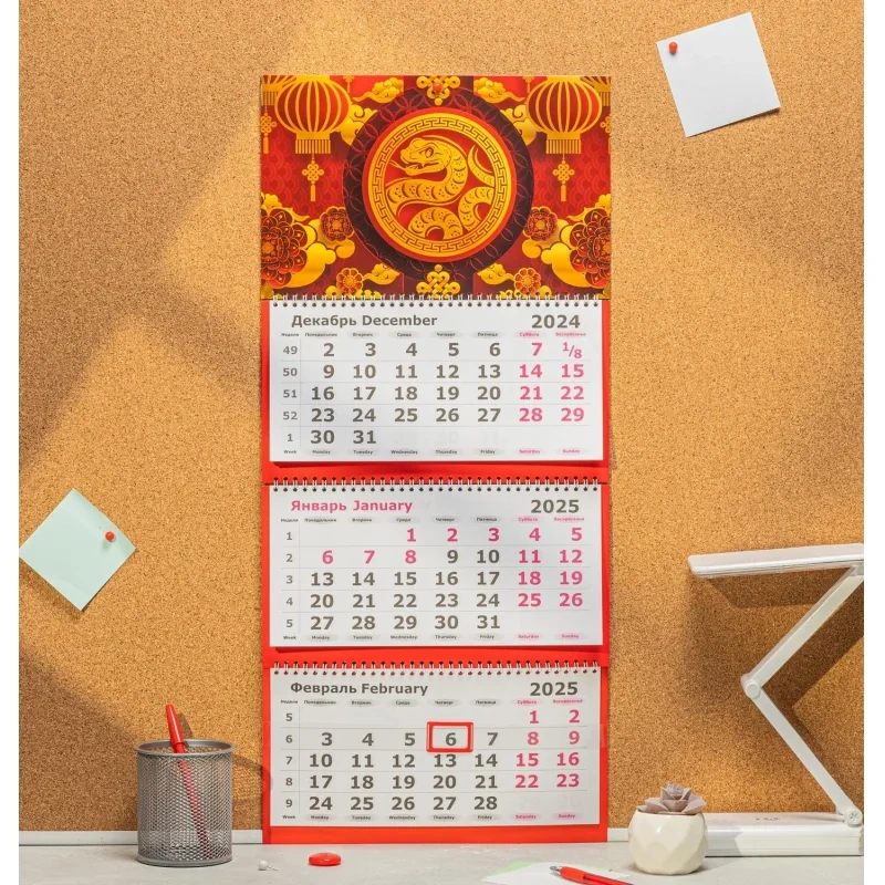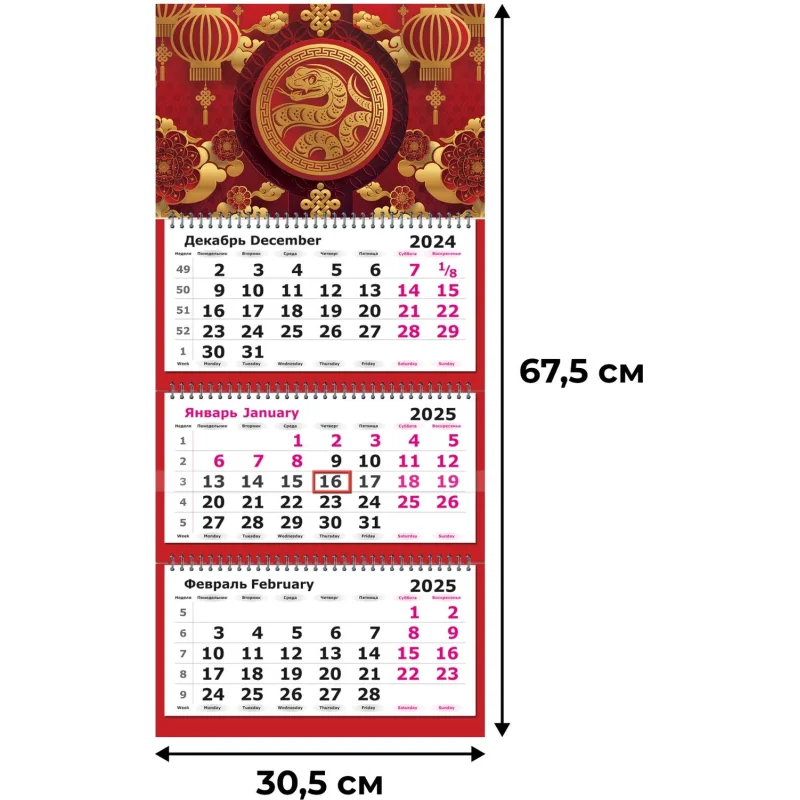 Календарь настенный 3-х блочный 2025,305х675,Китайская Змея,80г/м2 Настенный трехблочный календарь 'Китайская Змея' на 2025 год с курсором, формат 305x675 мм, в индивидуальной упаковке (пакете). Состоит из постера на мелованном картоне плотностью 300 г/кв.м, трех календарных блоков с нумерацией недель на офсетной бумаге. Календарь скреплен тремя металлическими гребнями, крепится на стену при помощи люверса.