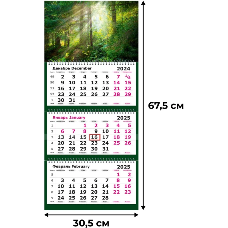 Календарь настенный 3-х блочный 2025,305х675,Лучи Света,3 спир,80г/м2 Настенный трехблочный календарь 'Лучи света' на 2025 год с курсором, формат 305x675 мм, в индивидуальной упаковке (пакете). Состоит из постера на мелованном картоне плотностью 300 г/кв.м, трех календарных блоков с нумерацией недель на офсетной бумаге. Календарь скреплен тремя металлическими гребнями, крепится на стену при помощи люверса.