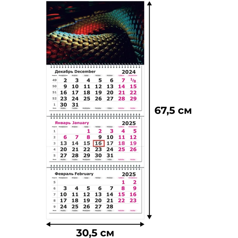 Календарь настенный 3-х блочный 2025,305х675,Символ Года. Яркая Змея,80г/м2 Настенный трехблочный календарь 'Символ года. Яркая Змея' на 2025 год с курсором, формат 305x675 мм, в индивидуальной упаковке (пакете). Состоит из постера на мелованном картоне плотностью 300 г/кв.м, трех календарных блоков с нумерацией недель на офсетной бумаге. Календарь скреплен тремя металлическими гребнями, крепится на стену при помощи люверса.