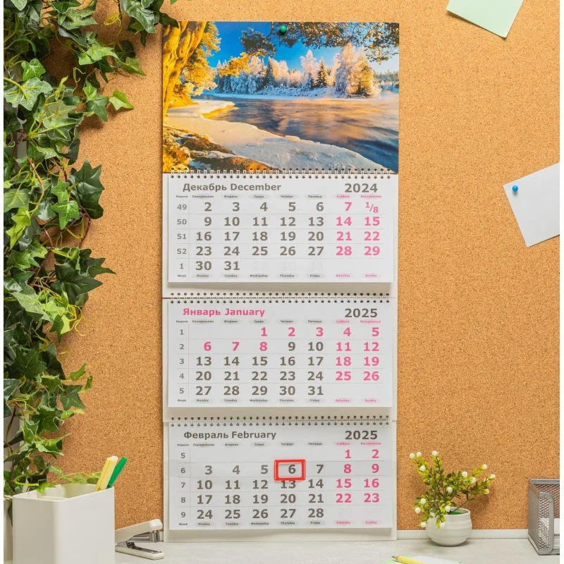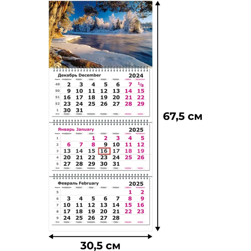 Настенный трехблочный календарь 'Снежный пейзаж' на 2025 год с курсором, формат 305x675 мм, в индивидуальной упаковке (пакете). Состоит из постера на мелованном картоне плотностью 300 г/кв.м, трех календарных блоков с нумерацией недель на офсетной бумаге. Календарь скреплен тремя металлическими гребнями, крепится на стену при помощи люверса. Размер подложки 305х160 мм, размер блока календаря 290х140 мм. Размер в сложенном виде 305х195 мм.
