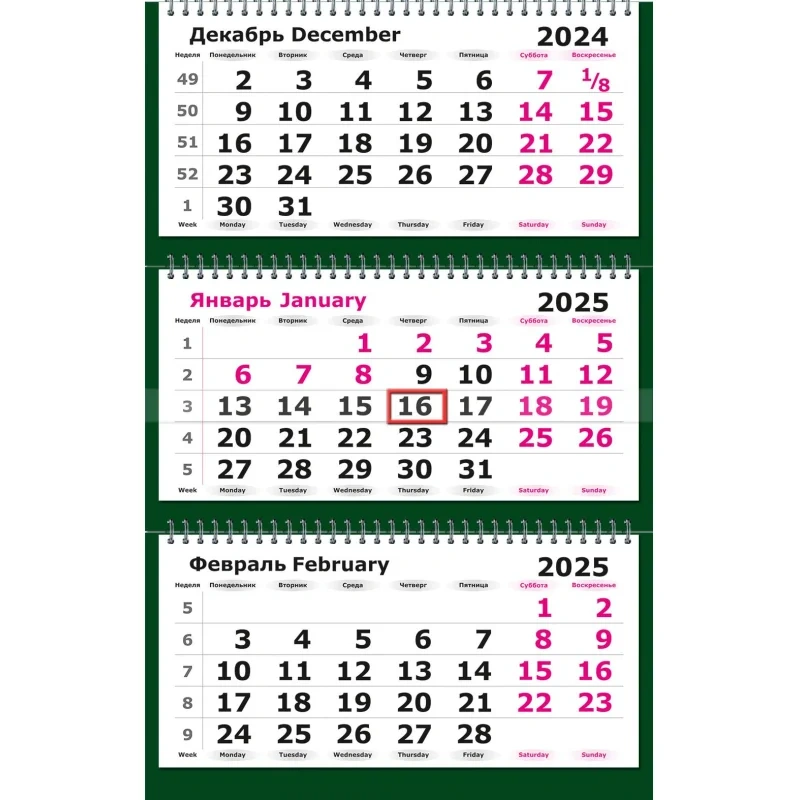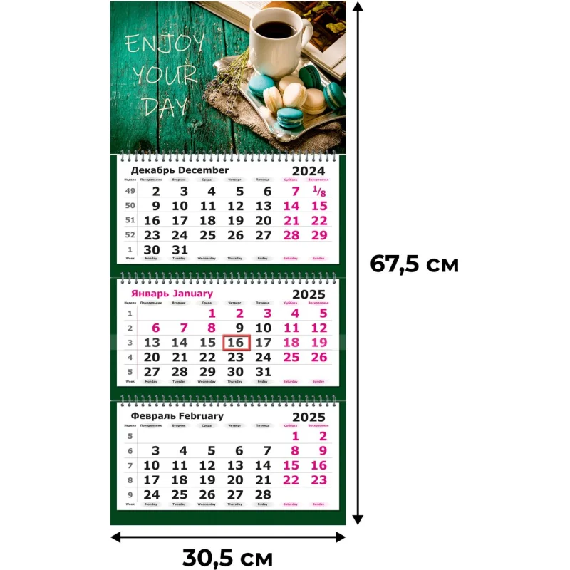 Календарь настенный 3-х блочный 2025 Кофе с макарунами,305х675,80г/м2 Настенный трехблочный календарь 'Кофе с макарунами' на 2025 год с курсором, формат 305x675 мм, в индивидуальной упаковке (пакете). Состоит из постера на мелованном картоне плотностью 300 г/кв.м, трех календарных блоков с нумерацией недель на офсетной бумаге. Календарь скреплен тремя металлическими гребнями, крепится на стену при помощи люверса.