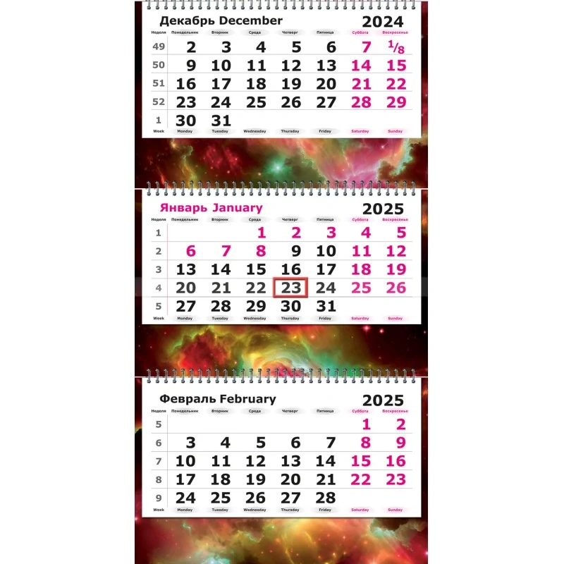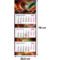 Календарь настенный 3-х блочный 2025,Огненная Змея,305х780, 80г/м2 Настенный трехблочный календарь 'Огненная змея' на 2025 год с курсором, формат 305x780 мм, в индивидуальной упаковке (пакете). Состоит из постера на мелованном картоне плотностью 300 г/кв.м, трех календарных блоков с нумерацией недель на офсетной бумаге и трех полноцветных подложек. Календарь скреплен тремя металлическими гребнями, крепится на стену при помощи люверса.