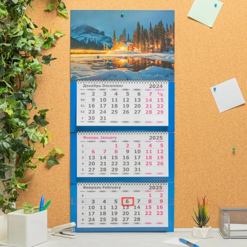 Календарь настенный 3-х блочный 2025,Премиум Ночной пейзаж,330х705,80г/м2 Настенный трехблочный Премиум календарь 'Ночной пейзаж' на 2025 год с курсором, формат 330x705 мм, в индивидуальной упаковке (пакете). Состоит из постера на мелованном картоне плотностью 300 г/кв.м, трех календарных блоков с нумерацией недель на офсетной бумаге и трех подложек. Календарь скреплен тремя металлическими гребнями, крепится на стену при помощи люверса.