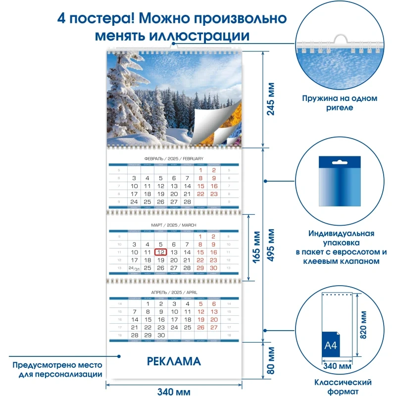 Календарь квартальный настенный 3-х блочный, 4 сменных постера 340 х 240 мм, мелованная бумага 130 г/кв.м, печать 4+0, 3 календарных блока 340х160 мм, мелованная бумага 105 г/кв.м, 4+0, 4 пружины, 1 ригель, курсор, подложка - картон одностороннего мелования 250 г/кв.м, место для рекламы 340х80 мм, Размер в сложенном виде 250х340 мм. Индивидуальная упаковка в пакет с еврослотом и клеевым клапаном. Любимая Русь? Леса, поля, луга, разливы, березки, маки? Насладиться щедростью и красотой русской земли можно, даже оставаясь в офисе или дома - стоит лишь полюбоваться уникальной подборкой фоторабот со страниц нашего календаря.