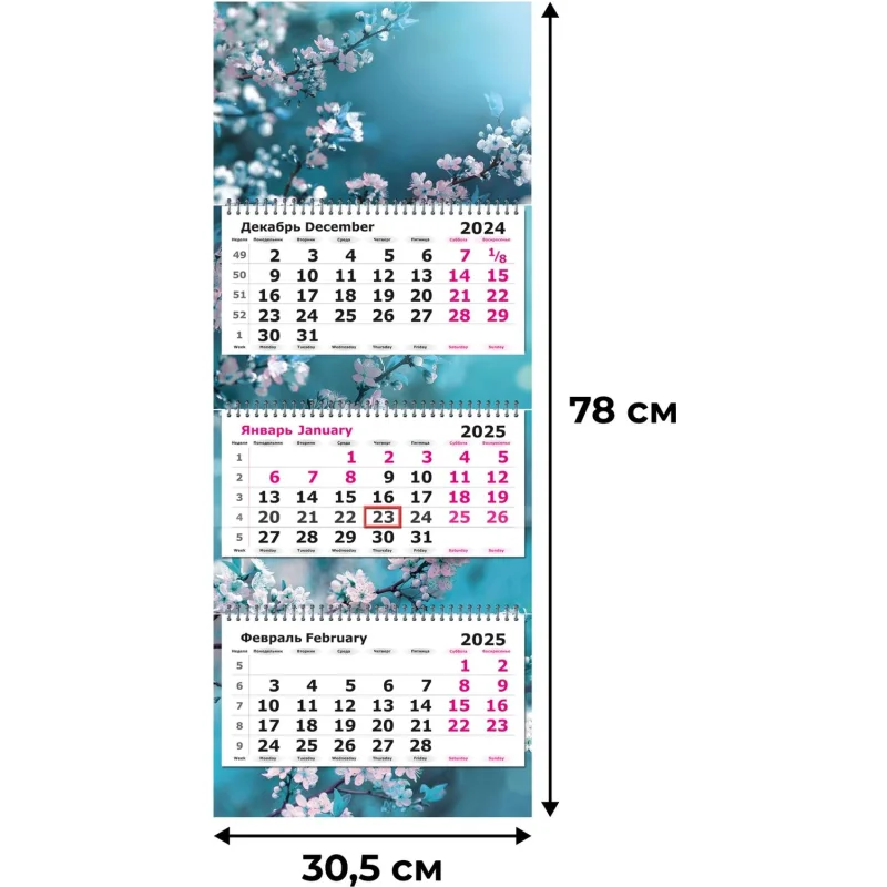 Календарь настенный 3-х блочный 2025,Ветка в цвету,305х780, 80г/м2 Настенный трехблочный календарь 'Ветка в цвету' на 2025 год с курсором, формат 305x780 мм, в индивидуальной упаковке (пакете). Состоит из постера на мелованном картоне плотностью 300 г/кв.м, трех календарных блоков с нумерацией недель на офсетной бумаге и трех полноцветных подложек. Календарь скреплен тремя металлическими гребнями, крепится на стену при помощи люверса.