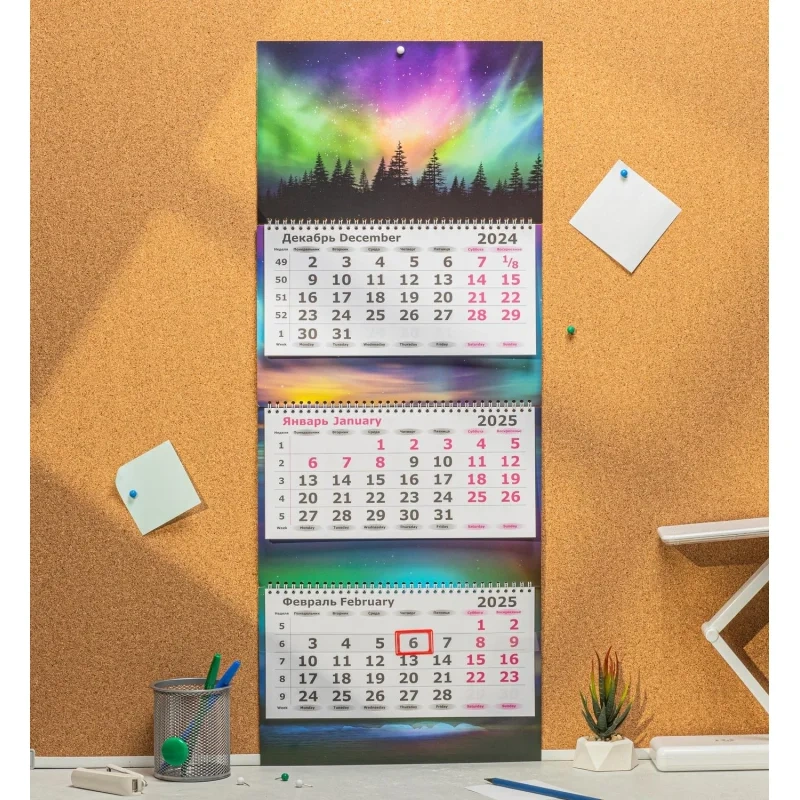 Календарь настенный 3-х блочный 2025,Яркая ночь,305х780, 80г/м2 Настенный трехблочный календарь 'Яркая ночь' на 2025 год с курсором, формат 305x780 мм, в индивидуальной упаковке (пакете). Состоит из постера на мелованном картоне плотностью 300 г/кв.м, трех календарных блоков с нумерацией недель на офсетной бумаге и трех полноцветных подложек. Календарь скреплен тремя металлическими гребнями, крепится на стену при помощи люверса.