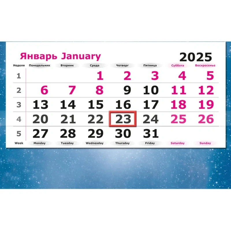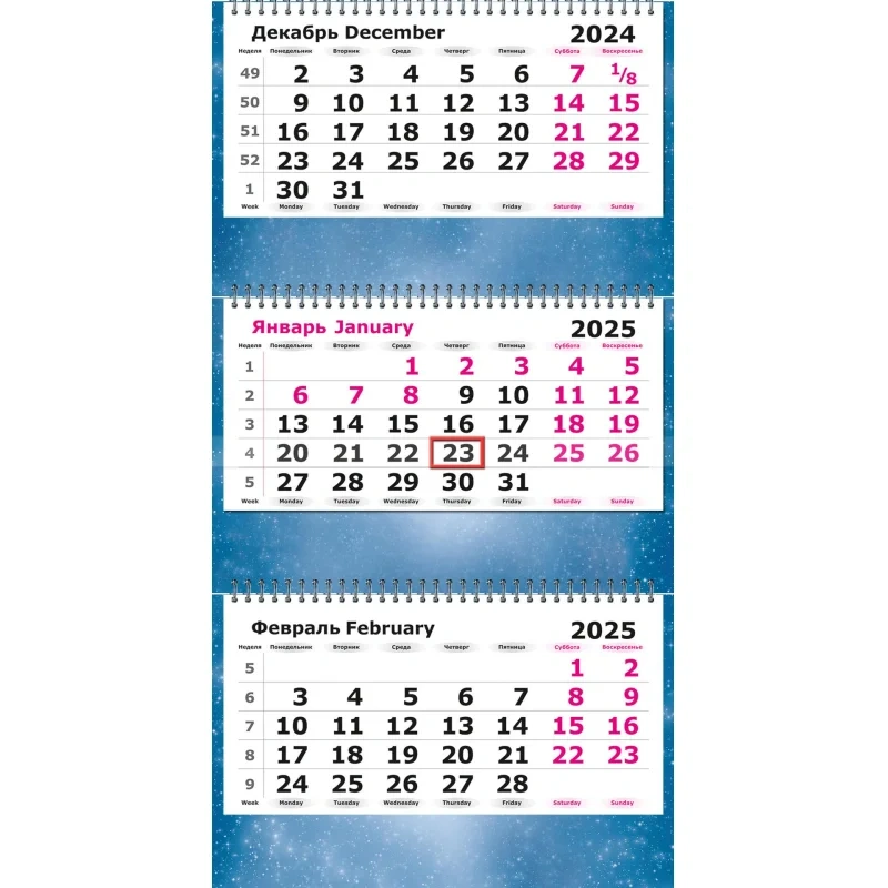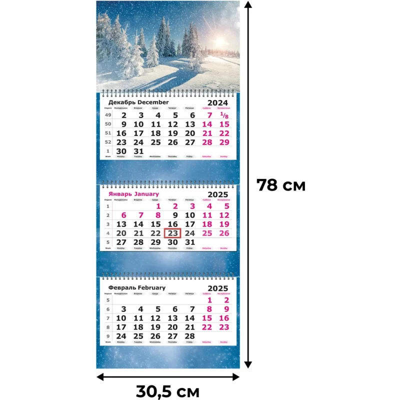 Настенный трехблочный календарь "Зимняя сказка" на 2025 год с курсором, формат 305x780 мм, в индивидуальной упаковке (пакете). Состоит из постера на мелованном картоне плотностью 300 г/кв.м, трех календарных блоков с нумерацией недель на офсетной бумаге и трех полноцветных подложек. Календарь скреплен тремя металлическими гребнями, крепится на стену при помощи люверса. Размер подложки 305х160 мм, размер самого блока календаря 290х140 мм. Размер в сложенном виде 305х195.5 мм.
