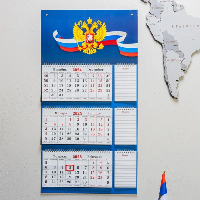 Календарь настенный 3-х блочный 2025Супер-Премиум+блокноты,440х835,Госсимв Настенный трехблочный Супер-Премиум календарь с блокнотами 'Госсимволика' на 2025 год с курсором, формат 440x835 мм, в индивидуальной упаковке (пакете). Состоит из постера на мелованном картоне плотностью 300 г/кв.м, трех календарных блоков с нумерацией недель на мелованной бумаге, трех блокнотов для заметок и трех подложек. Календарь скреплен тремя металлическими гребнями, крепится на стену при помощи двух люверсов.