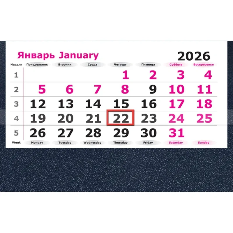 Настенный трёхблочный отрывной календарь размером 305×780 мм. Шпигель — формат 305×195 мм, мелованный картон 300 г/кв.м, блок — формат 290×140 мм, офсетная бумага 80 г, печать в 2 цвета, крепление: каждая секция на мет. гребне, с бегунком и люверсом, индивидуальная упаковка. Полноцветные подложки (плотный картон 300 г/кв.м.) составляют со шпигелем единый дизайн.