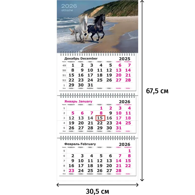 Календарь настенный 3-х блочный 2026 Attache, Лошади, 305х675, 80г