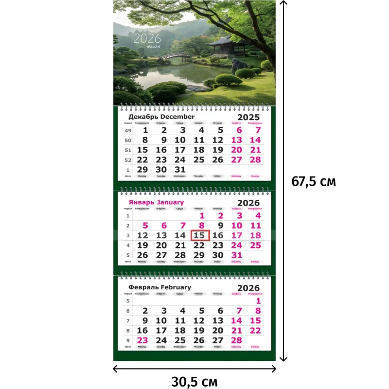 Календарь настенный 3-х блочный 2026 Attache Трио Стандарт,Дер.вода,305х675