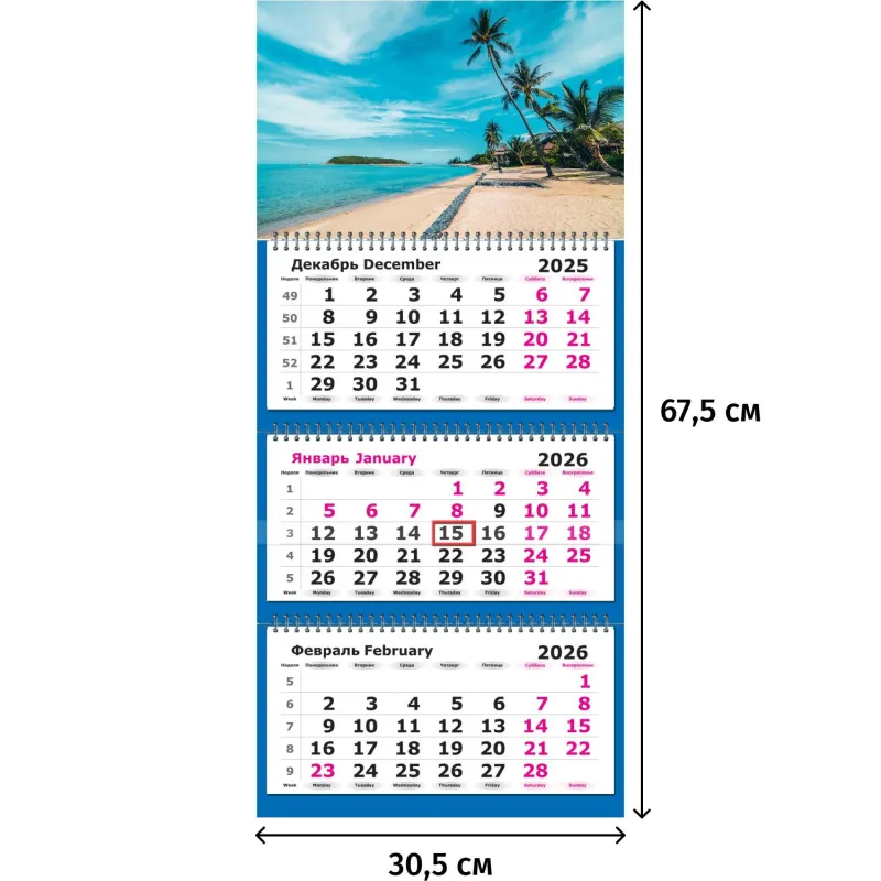 Календарь настенный трёхблочный Attache «Тропики» размером 30.5×67.5 см. Настенный трёхблочный отрывной календарь. Общий размер календаря — 305×675 мм.