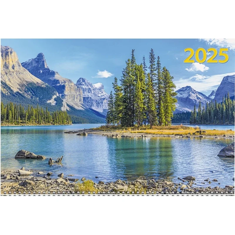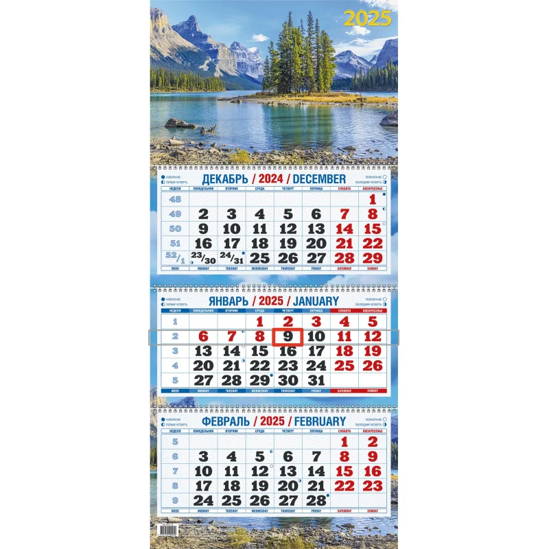Календарь настен 3-х бл,2025,Озеро в горах,офс,310х680,КБ11-25 Настенный квартальный трехблочный календарь на 2025 год с курсором, формат 310х680 мм, в индивидуальной упаковке (европакет с подвесом). Состоит из красочного постера на мелованном картоне плотностью 250 г/кв.м, покрытого глянцевым УФ-лаком, трех календарных блоков с нумерацией недель на офсетной бумаге плотностью 60 г/кв.м, запечатанных в 2 краски, и полноцветных красочных подложек (мелованный картон плотностью 200 г/кв.м, покрытый глянцевым УФ-лаком). Календарь скреплен тремя металлическими гребнями, вешается на стену при помощи кольца (пикколо)