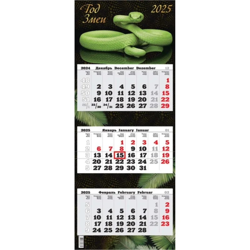 Календарь настен 3-х бл,2025,ПРЕМ ТРИО Год Змеи,офс,340х840,1225006 ?Настенный трехблочный квартальный календарь на? ?2025 год премиум-класса на? ?единой подложке с? ?курсором, формат в? ?развернутом виде 340??x??840? ?мм, в? ?индивидуальной упаковке (европакет с? ?подвесом). Календарь состоит из? ?единой подложки с? ?постером и? ?трех календарных блоков с? ?нумерацией недель. Подложка? ?-?? мелованный картон плотностью 270? ?г/кв.м, полноцветная печать с? ?отделкой вододисперсионным лаком. Отделка постеров? ?- тиснение золотистым цветом, а? ?также выборочная отделка УФ-лаком с? ?глиттером. Блоки? ?- офсетная бумага плотностью 70? ?г/кв.м? ?с перфорацией, печать в? ?две краски. Календарь вешается на? ?стену при помощи кольца (пикколо)??.? ?Размер в? ?сложенном виде 340??x??210? ?мм??.?