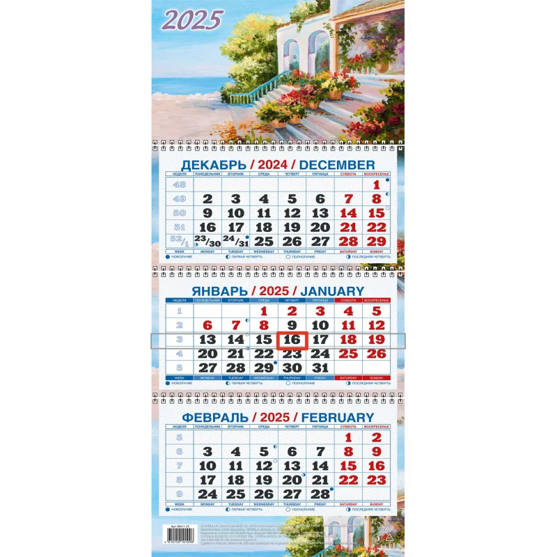 Календарь настен 3-х бл,2025,Приморский пейзаж,офс,195х465,КМ11-25 ?Настенный квартальный трехблочный календарь на? ?2025 год с? ?курсором, формат в? ?разложенном виде 195??x??465? ?мм, в? ?индивидуальной упаковке (европакет с? ?подвесом). Состоит из? ?красочного постера на? ?мелованном картоне плотностью 250? ?г/кв.м, покрытого глянцевым УФ-лаком, трех календарных блоков на? ?офсетной бумаге плотностью 60? ?г/кв.м, запечатанных в? ?2? ?краски, и? ?полноцветных красочных подложек (мелованный картон плотностью 200? ?г/кв.м, покрытый глянцевым УФ-лаком). Календарь скреплен тремя металлическими гребнями, вешается на? ?стену при помощи кольца (пикколо??)??.?