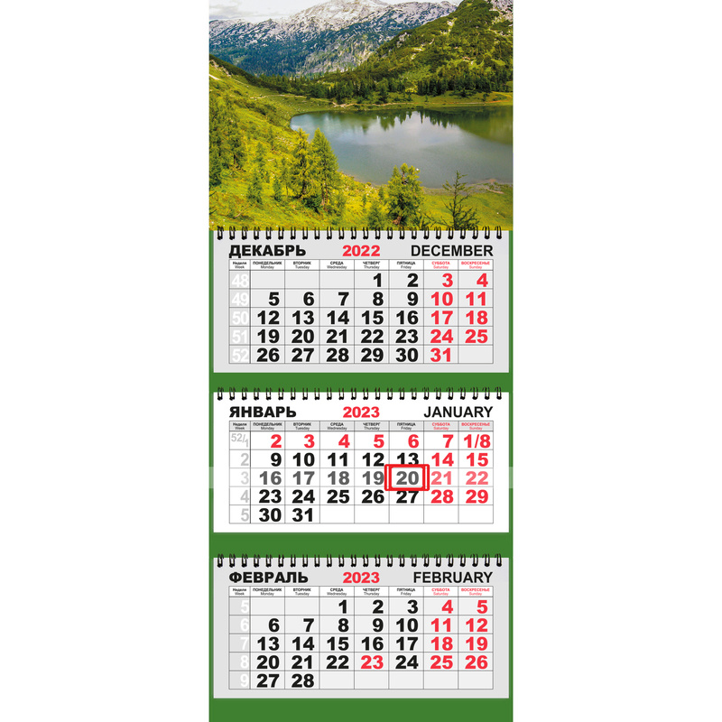 Большой настенный квартальный календарь 297?710 мм с изображением природы «Горное живописное озеро» — многофункциональный помощник на 2023 год для дома и офиса. Красочный лакированный постер 297?220, напечатанный на картоне плотностью 250 г/м2, украсит интерьер и подарит замечательное романтическое настроение. Подложка календаря изготовлены из плотного мелованного картона. Календарная сетка состоит из трех блоков, напечатанных на белой офсетной бумаге 80 г/м2 в 2 краски, и скреплены тремя металлическими гребнями. Размер в сложенном виде 297?320 мм. В конструкции календаря предусмотрено отверстие для крепления на стене — металлический люверс. Передвижной бегунок (курсор) используется для выделения текущей даты. Выходные и праздничные дни выделены красным цветом. Каждый календарь поставляется в упаковке.