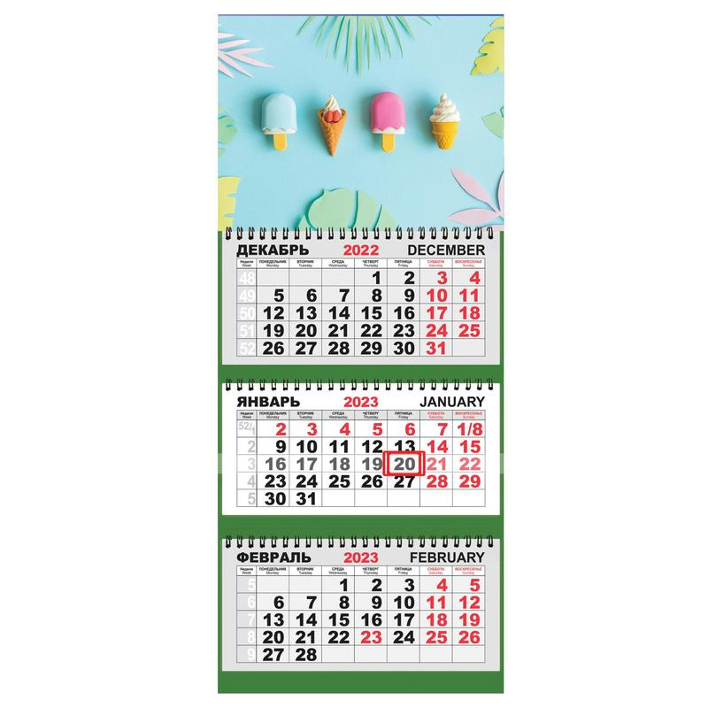 Большой настенный квартальны календарь 295?710 мм. с изображением лакомства'Мороженое» — многофункциональный помощник на 2023 год для дома и офиса. Красочный лакированный постер 297?220 мм, напечатанный на картоне плотностью 250 г/м2, украсит интерьер и подарит замечательное настроение. Подложка календаря изготовлены из плотного мелованного картона. Календарная сетка состоит из трех блоков, напечатанных на белой офсетной бумаге 80 г/м2 в 2 краски, и скреплены тремя металлическими гребнями. Рзмер в сложенном виде 297?320 мм. В конструкции календаря предусмотрено отверстие для крепления на стене — металлический люверс. Передвижной бегунок (курсор) используется для выделения текущей даты. Выходные и праздничные дни выделены красным цветом. Каждый календарь поставляется в индивидуальной упаковке.