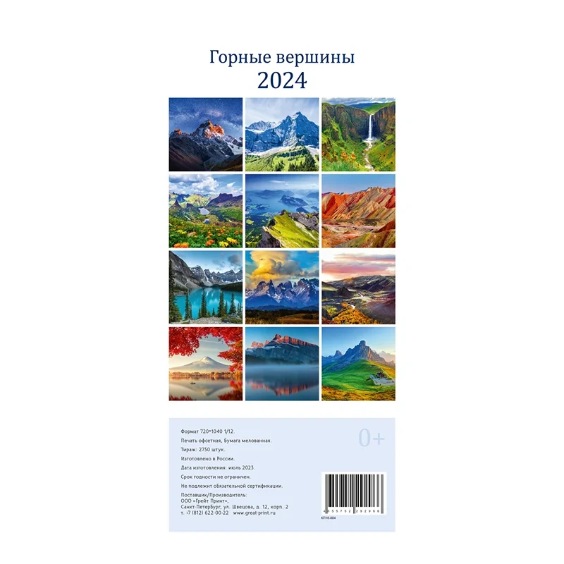 Календарь настенный Грейт Принт Горные вершины 16.5х34см, на гребне, 2024