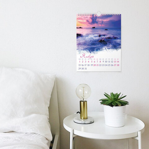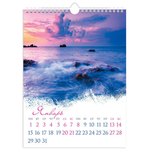 Настенный перекидной календарь на гребне с ригелем (металлический стержень с петлей). Полный формат: 220х300 мм, объем: 12 страниц. Обложка: мелованная бумага 200 г/м2. Внутренний блок: мелованная бумага 115 г/м2. Индивидуальная упаковка с европодвесом.
