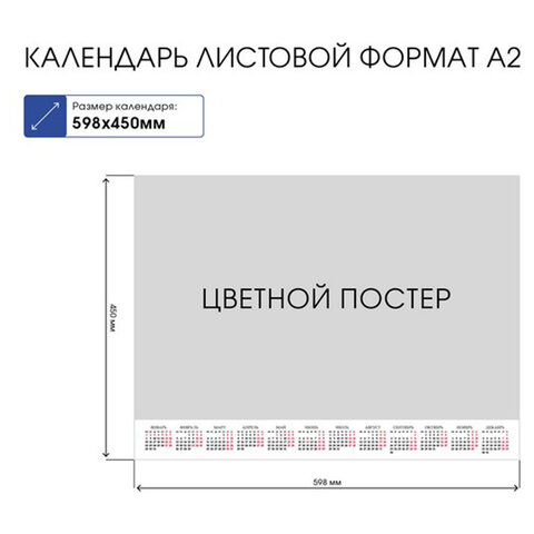 Календарь листовой А2 формата (600х450 мм). Выполнен на импортной высококачественной бумаге 3-кратного мелования 135 г/м2.