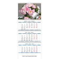 Календарь квартальный трехблочный настенный на 2023 год. Яркие букеты создающие позитивное настроение. Формат: 345?750 мм; 4 сменных постера 345?240 мм: мелованная высокохудожественная бумага 170г/м2, матовый лак. Блок: мелованная бумага, 90 г/м2, печать в четыре краски, курсор, 4 спирали, ригель. Упаковка — пакет с еврослотом.